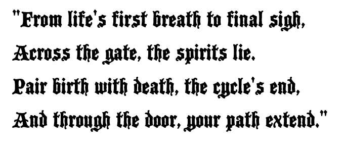 As the PCs approach the gate, they notice a row of six gravestones on each side of the gate. Each gravestone has an inscription with the name and lifespan of a person. The gate itself is locked and magically sealed, preventing any attempts to force it open.