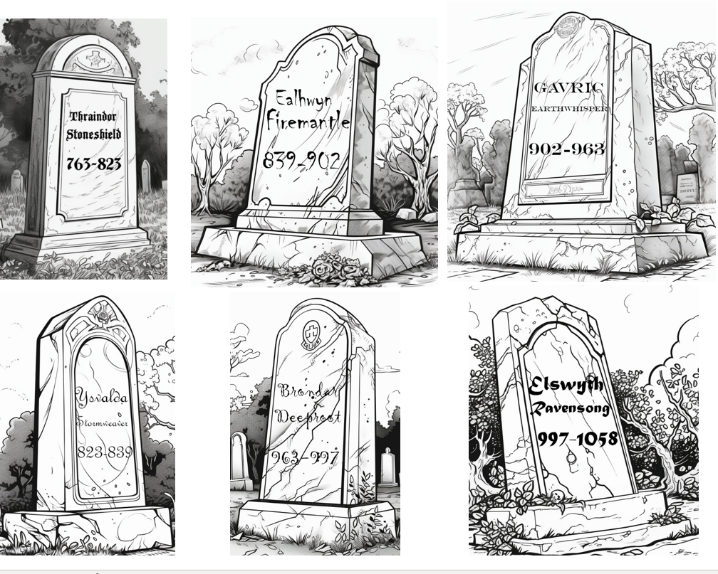 Gavric Earthwhisper, 902-963 Elswyth Ravensong, 997-1058 (lying on the ground)